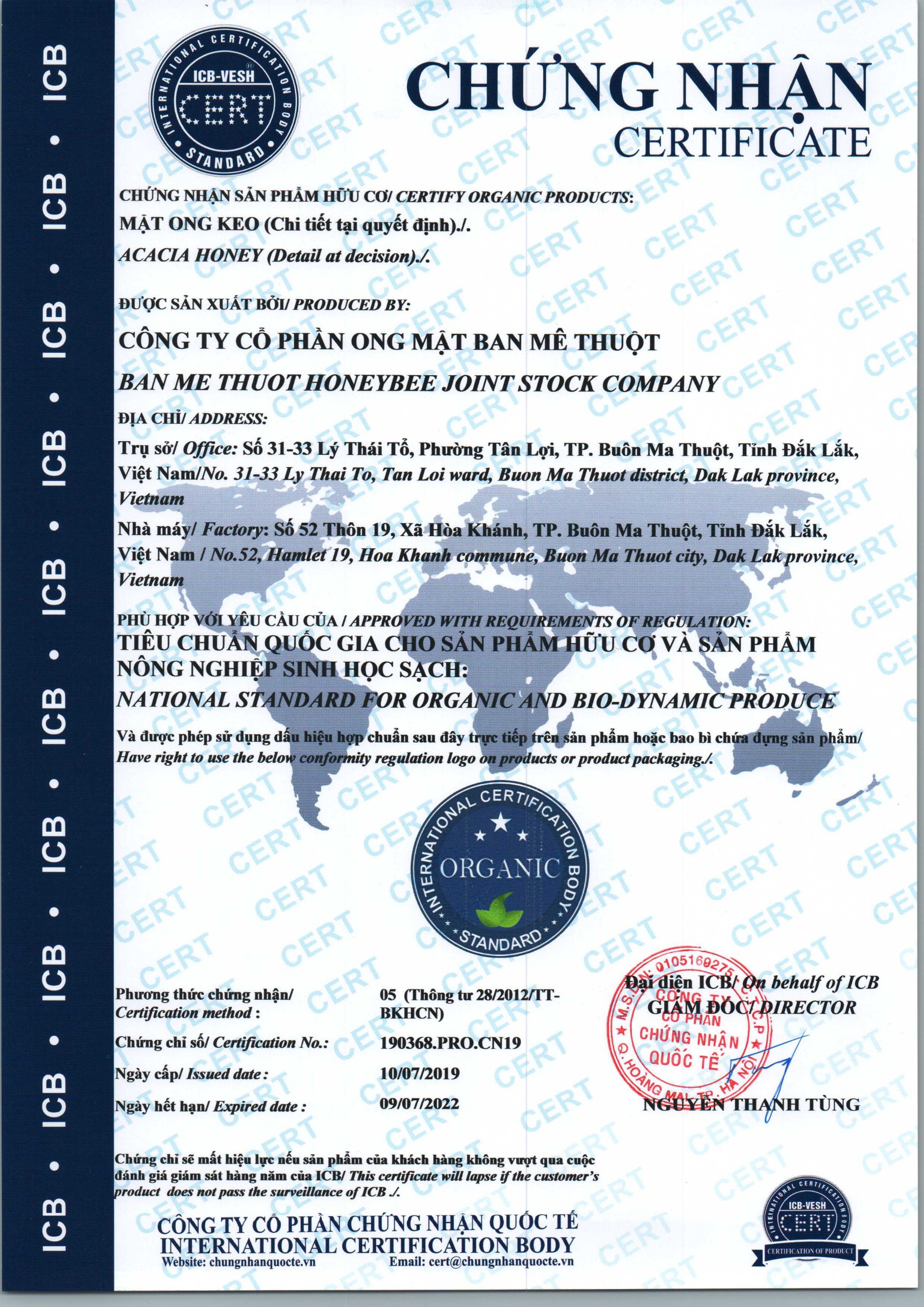 Năm 2019, ICB đã tiến hành đánh giá và cấp chứng nhận Nông nghiệp hữu cơ ORGANIC cho Công ty Cổ phần Mật ong Ban Mê Thuột với sản phẩm Mật ong keo.