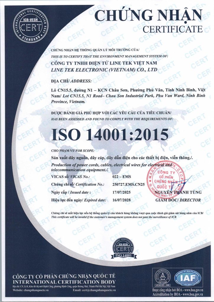 Tiêu chuẩn chứng nhận/ Standards: ISO 14001:2015